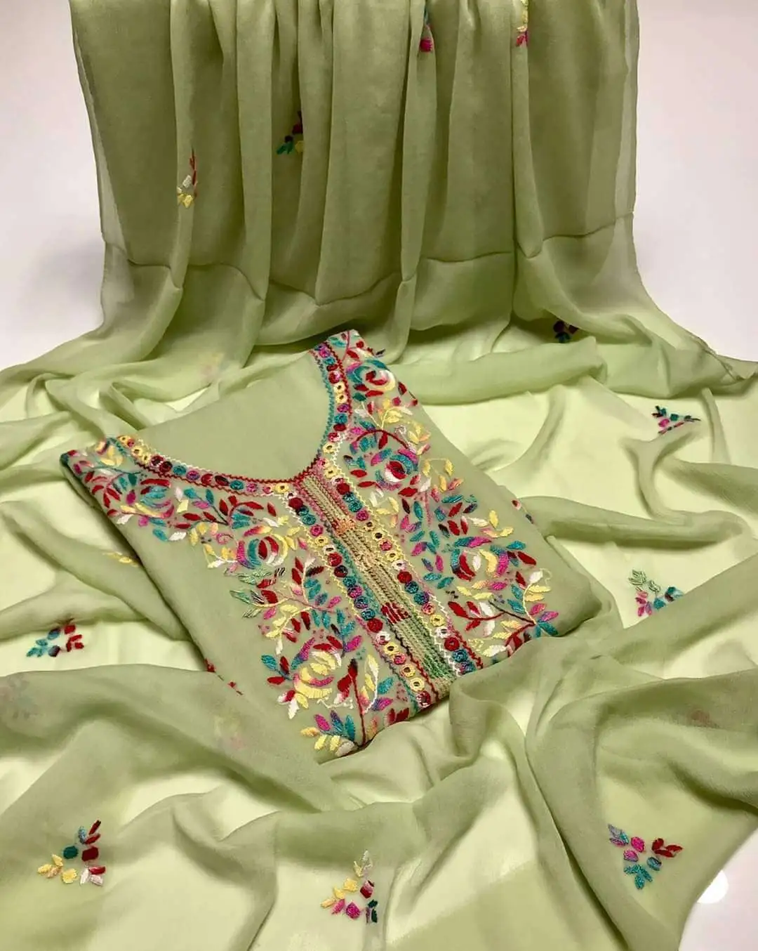 - Handmade Soft Chiffon Pakka Shadow Sheesha Embroidery Shirt & Dupatta
